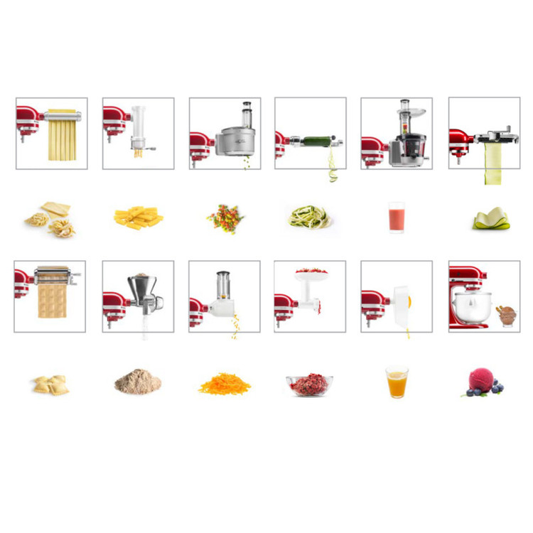 قابلیت اتصال متعلقات جانبی مختلف به دستگاه( آبمرکبات گیری، چرخ گوشت، عصاره گیر و پوره ساز، غذاساز، نورد و اسپاگتی ساز، پاستا سازو ...) ساخت کشور آمریکا بدنه تمام فلزی دارای درب پوش محافظ پاشش