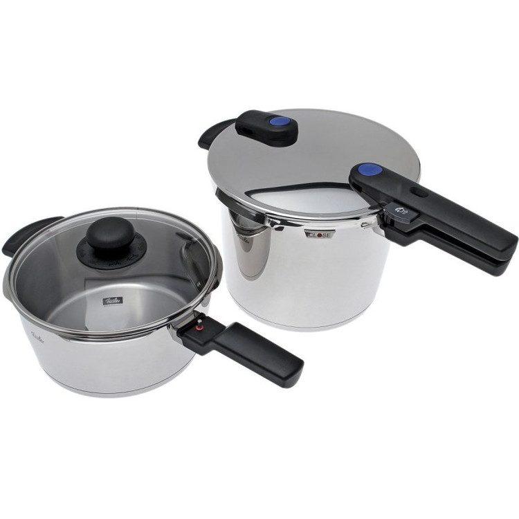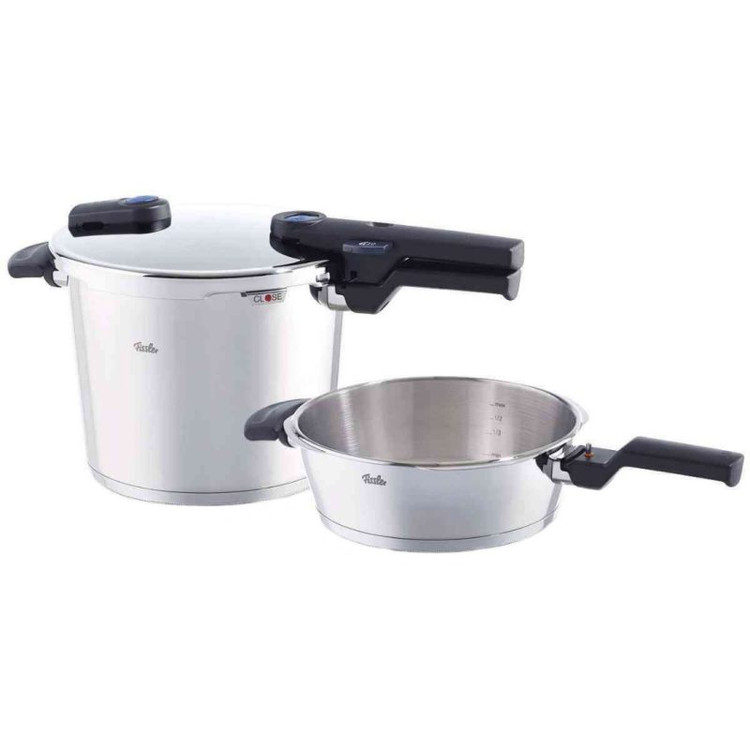 دارای دو زودپز در سایزهای 6 و 3.5 لیتر ساخت کشور آلمان قابلیت استفاده بر روی انواع اجاق حجم فشار داخلی زودپز 150 کیلو پاسکال که در بین زودپزهای بازار بیشترین حجم ذخیره بخار را داراست دارای درب شیشه ای مجزا جهت استفاده بعنوان قابلمه استیل